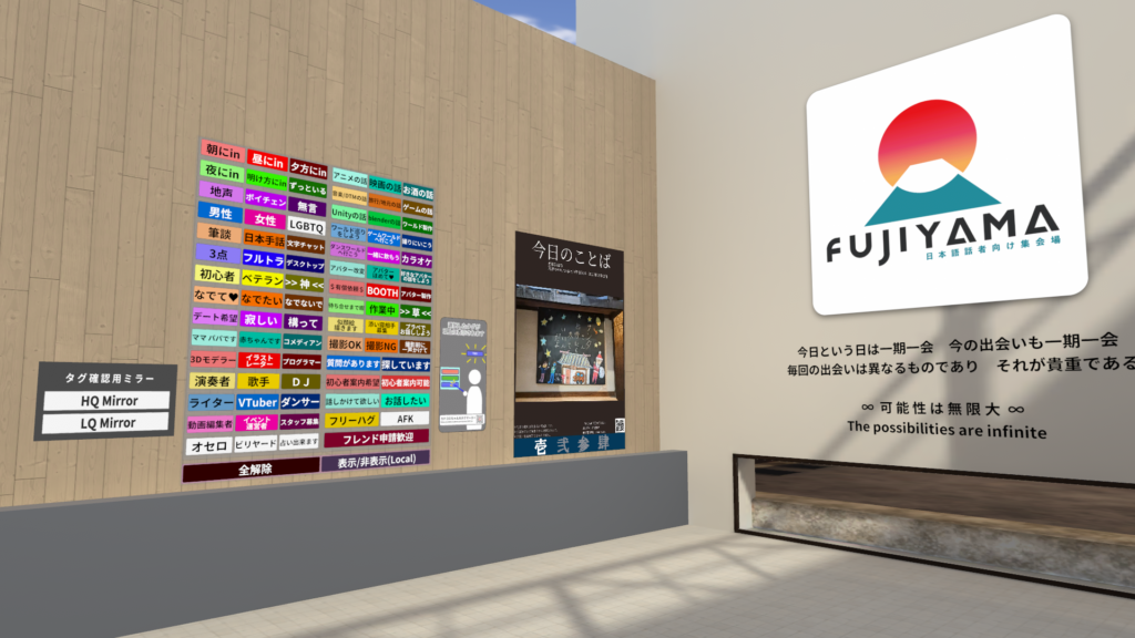 「FUJIYAMA」は公式では「日本語話者向け集会場」という説明がされていますが、それだけではこのワールドの魅力が十分に伝わらないかもしれません。そこで、私の視点からその魅力をお伝えしたいと思います!